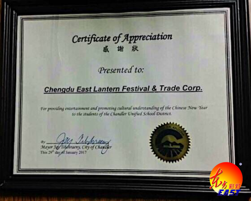 自貢燈貿(mào)集團(tuán)股份有限公司、四川藝思特彩燈文化傳播有限公司主辦的“2016世界之光——彩燈嘉年華”跨年燈展,于當(dāng)?shù)貢r(shí)間2017年1月29日在美國亞利桑那州首府菲尼克斯(鳳凰城)順利落下帷幕。成都市委副秘書長、印第安納州州長 Burns Mike及當(dāng)?shù)卣獑T出席閉幕式并代表州政府對本次燈展頒發(fā)特令嘉獎(jiǎng)。