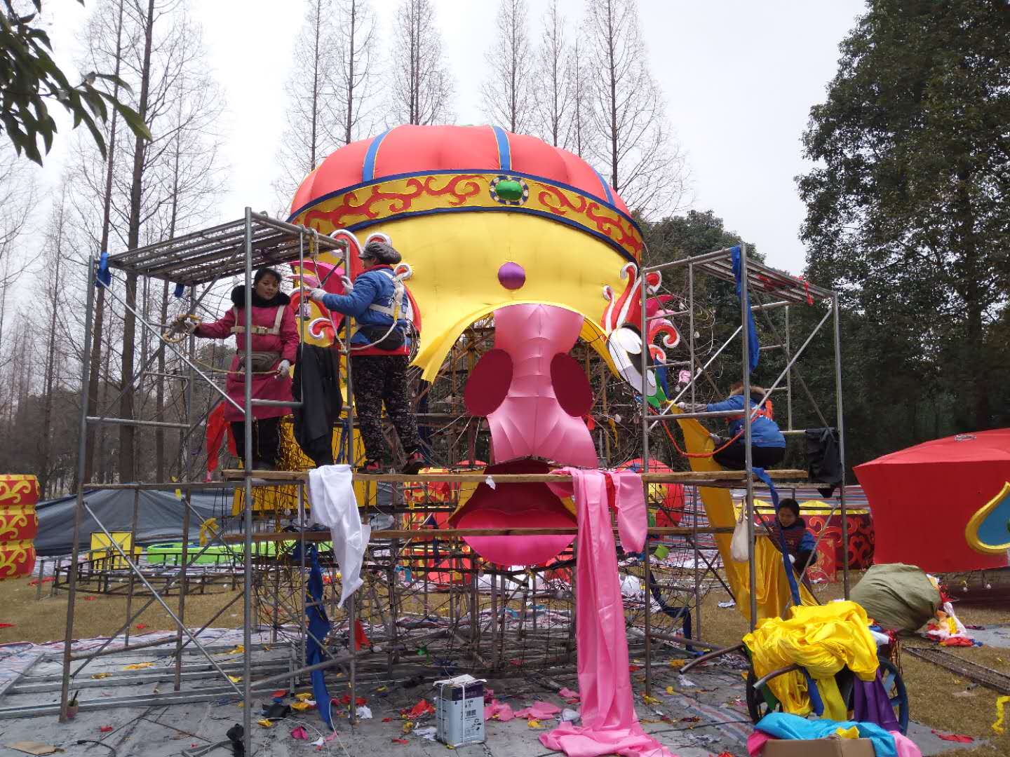 目前,東方彩燈身懷技藝的制燈匠人正緊鑼密鼓的制作中。那些看上去冰冷粗獷的鐵絲、綢緞,在他們“馴化”下變得溫順隨和,一組組或生動(dòng)、或委婉、或雄渾的燈組栩栩如生。本屆“太陽(yáng)節(jié)”較大的突破是所有燈組均采用節(jié)能環(huán)保燈具,較之往年減少三分之二的用電負(fù)荷,打造炫彩奪目的燈光效果的同時(shí),保護(hù)了環(huán)境和游客。在制作方面,部分主要大型燈組均采用加密色丁布裝飾,傳統(tǒng)燈組結(jié)合現(xiàn)代科技,民俗風(fēng)情融合時(shí)尚藝術(shù),集現(xiàn)代感、藝術(shù)感為一體,凸顯顏色豐富的層次感。