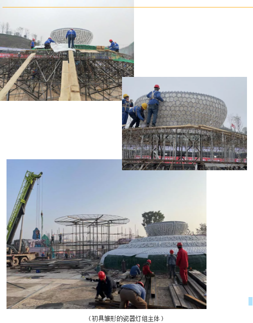 燈貿(mào)集團(tuán)執(zhí)行總裁陶建軍介紹:“《巴蜀一家親》主燈組體量龐大,長22米,高28米。材質(zhì)為瓷器,該燈組最大的特色是瓷器內(nèi)光源的一個(gè)創(chuàng)新,景德鎮(zhèn)“玲瓏碗”,4+7光色的變化,晶瑩剔透,美輪美奐”
