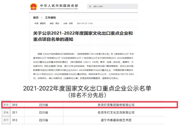 近日,商務部、中宣部、財政部、文化和旅游部、國家廣電總局五部委聯(lián)合公示《2021—2022年度國家文化出口重點企業(yè)和重點項目名單》,自貢燈貿(mào)集團股份有限公司再次入錄“2021-2022年度國家文化出口重點企業(yè)”公示名目。這是自貢燈貿(mào)集團股份有限公司自2007年以來,連續(xù)第八次榮獲此殊榮,也是全國彩燈行業(yè)唯一連續(xù)八屆十六年獲此殊榮的服貿(mào)類企業(yè)。